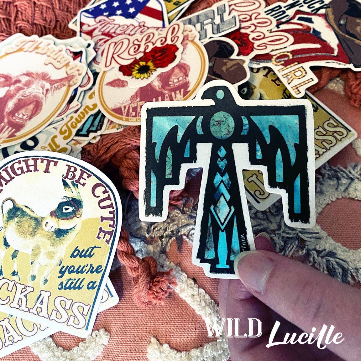 Original design from our collab with Wild Lucille Apparel! Unique and original turquoise thunderbird southwestern decal.